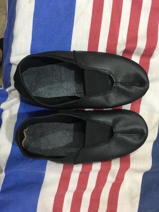 Black Leather Gymnastic Shoes, made by genuine leather and front elastic with inner playboy and foam sole and outer rubber and suede leather sole.