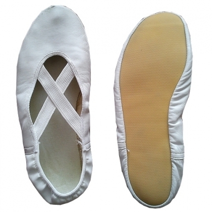 White Leather Gymnastic Shoes, made by genuine leather and front elastic with inner playboy and foam sole and outer rubber and suede leather sole.